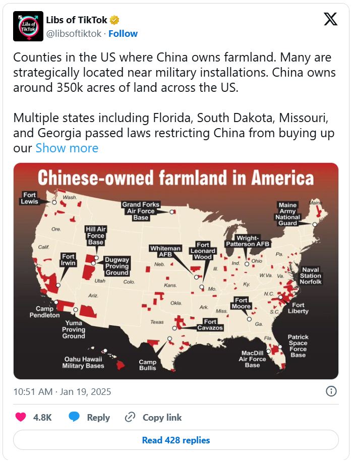 7. The acquisition of hundreds of thousands of acres of American farmland in close proximity to key American military installations, including missile bases, Air Force bases and major Army and Navy installations that could act as rally points for attacks on those nearby installations.