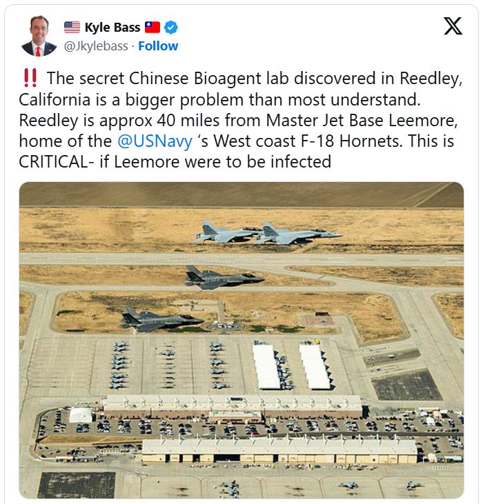 9. The establishment of a bioweapons stockpile at Reedly, California, near Naval Air Station Lemoore (about 40 miles west) and the Fresno Air National Guard Base (about 20 miles north). Other significant bases within striking distance of Reedly include Fort Hunter Liggett, Beale Air Force Base, and Vandenberg Space Force Base, as well as major military-industrial and tech companies.