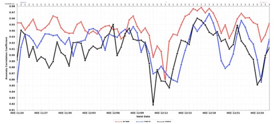 I am watching them. So far, they are a joke. All over the place, little run to run consistency. In short, they mimic the NOAA GEFS, the flagship of the US models that over the years billions have been spent to develop, being abysmally in last place even on day 5 vs the European (red) and Canadian (blue). I am sure the UKMET is beating it, too.