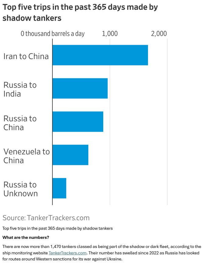 There are now more than 1,470 tankers classed as being part of the shadow or dark fleet, according to the ship monitoring website TankerTrackers.com. Their number has swelled since 2022 as Russia has looked for routes around Western sanctions for its war against Ukraine.