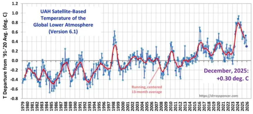 Exhibit 1: The accurate UAH satellite record shows the plunge clearly with the difference or anomaly from the 1991-2020 average falling during 2025 to end the year at just 0.3°C.