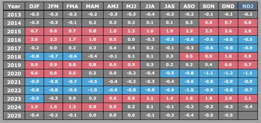 Exhibit 2: Along the equatorial Pacific Ocean, sea surface temperatures (SSTs) have been falling for months. In its recent report on the formation of El Niño (warming) and La Niña (cooling) oscillations, the US weather service NOAA provides the latest three-month running anomalies. Since last September, NOA notes “below average SSTs persist across most of the equatorial Pacific”.