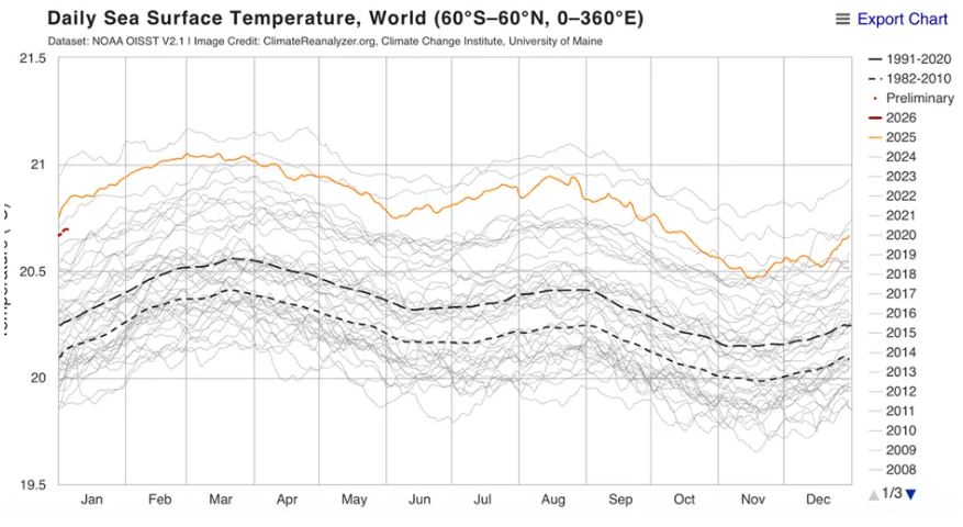 Again, it seems temperatures are coming off the boil, with 2026 starting cooler than 2025, which was cooler than 2024.