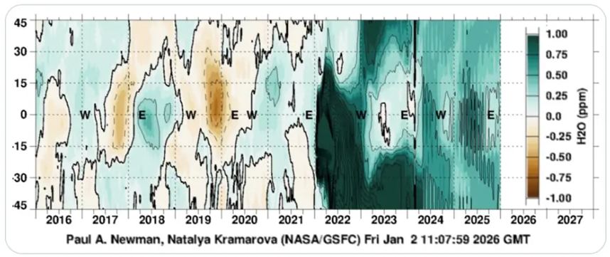 The scale of the massive increase in stratospheric water vapour can be seen in the latest measuring chart from NASA shown below. There is still a lot of extra water compared to the years before 2022, but it is gradually decreasing.