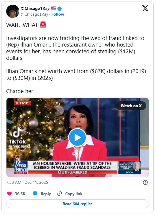 Rep. Randy Fine (R-FL) recently announced plans to introduce a resolution seeking Omar’s expulsion from Congress. Fine has also criticized Minnesota Gov. Tim Walz over the fraud issue, stating that Walz “should be in jail.”
