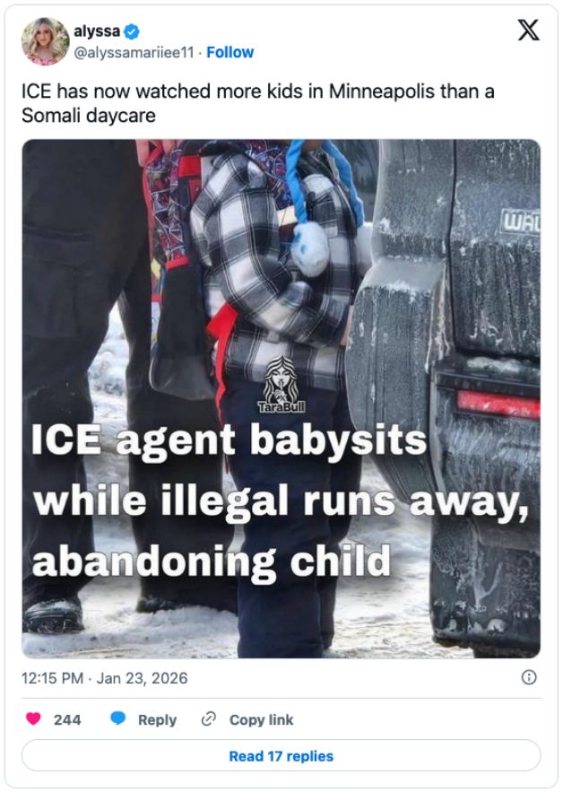 As to the bait-boy hoax, the fleeing father was Ecuadorian illegal Adrian Alexander Conejo Arias. The abandoned child, his son, is Liam Conejo Ramos. ICE, of course, wasn’t going to leave the boy to freeze in the street. So they took him home to his mother.