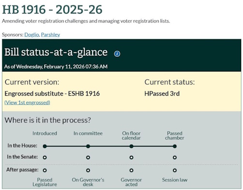 Yesterday ESHB 1916, passed off the House floor by a party-line vote (58-38) and is now headed to the Senate. Legislative Democrats want to make voter challenges more difficult, even to the point of criminalizing the process. If you do voter challenges wrong (against new standards), you could face criminal charges.