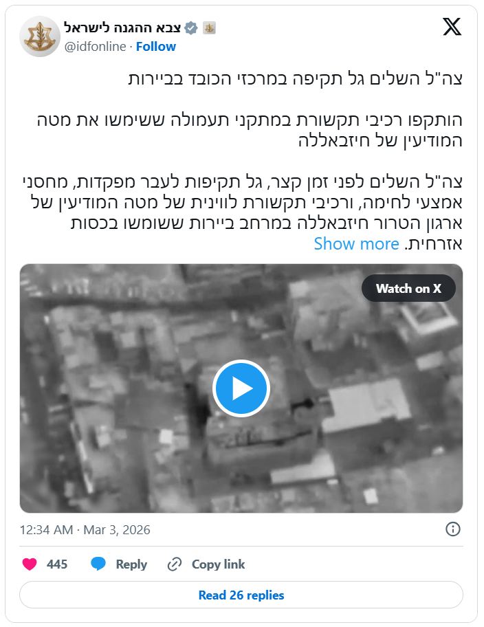 The IDF completed a short time ago a wave of strikes targeting command centers, weapons storage facilities, and satellite communication components of the Hezbollah terror organization’s intelligence headquarters in the Beirut area, which were used under civilian cover.