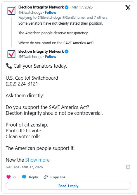 - The Election Integrity Network has united more than 80 organizations and mobilized 700+ state legislators who signed letters to Senate leadership demanding a real vote on the SAVE America Act, not a quiet procedural kill.