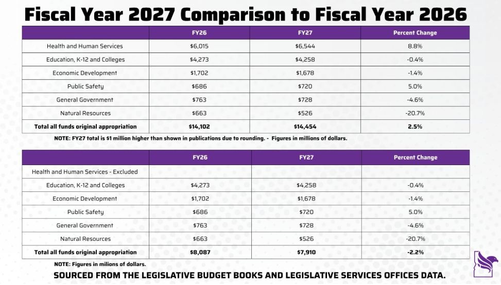 A bit of background: The legislative session essentially splits fiscal years. Currently, we are in FY26, which ends on June 30, 2026. When the Legislature convened in January, it considered updates to the FY26 budget, meaning increases or decreases, and set the budget for the following fiscal year.