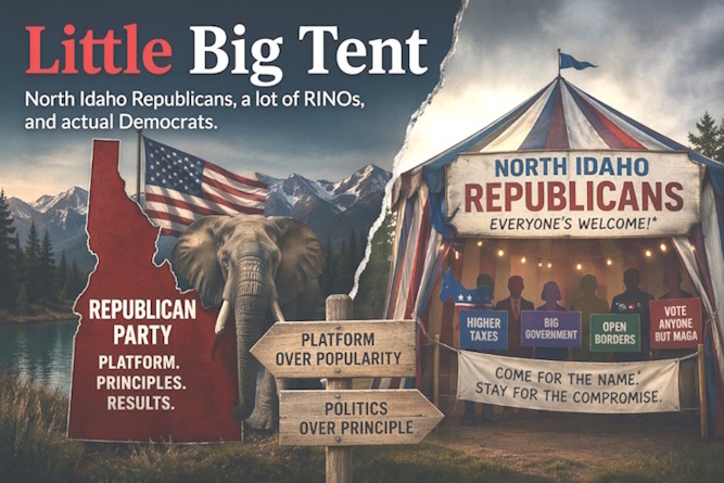 Critics of the Kootenai County Republican Central Committee (KCRCC) claim that efforts to vet candidates, make recommendations, and uphold the principles in the Republican Party Platform are destructive to the party and will drive away members. They say the Republican Party needs to be a “big tent” that accepts all viewpoints, and that any effort to expose Democrats posing as Republican candidates is a purity test that must be abolished.
